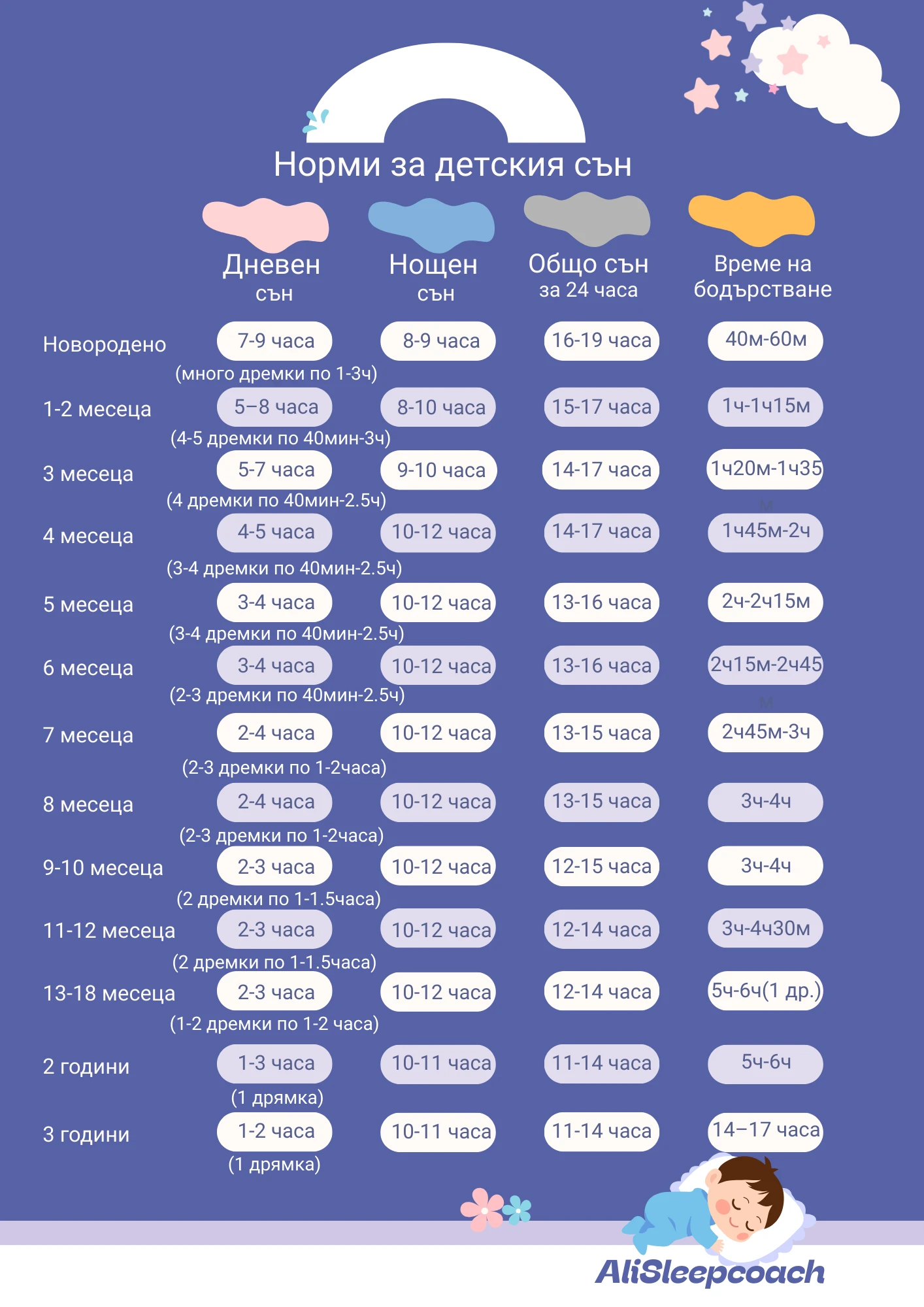 - Таблицата съдържа нормите за навършените месеци. Пример: за дете на 4месеца и 10 дни, интервалът на бодърстване е 1ч45м - 2 часа.